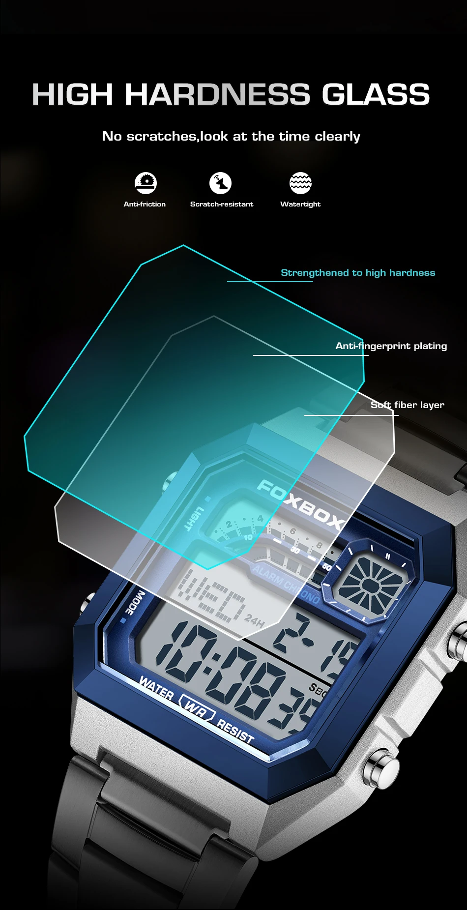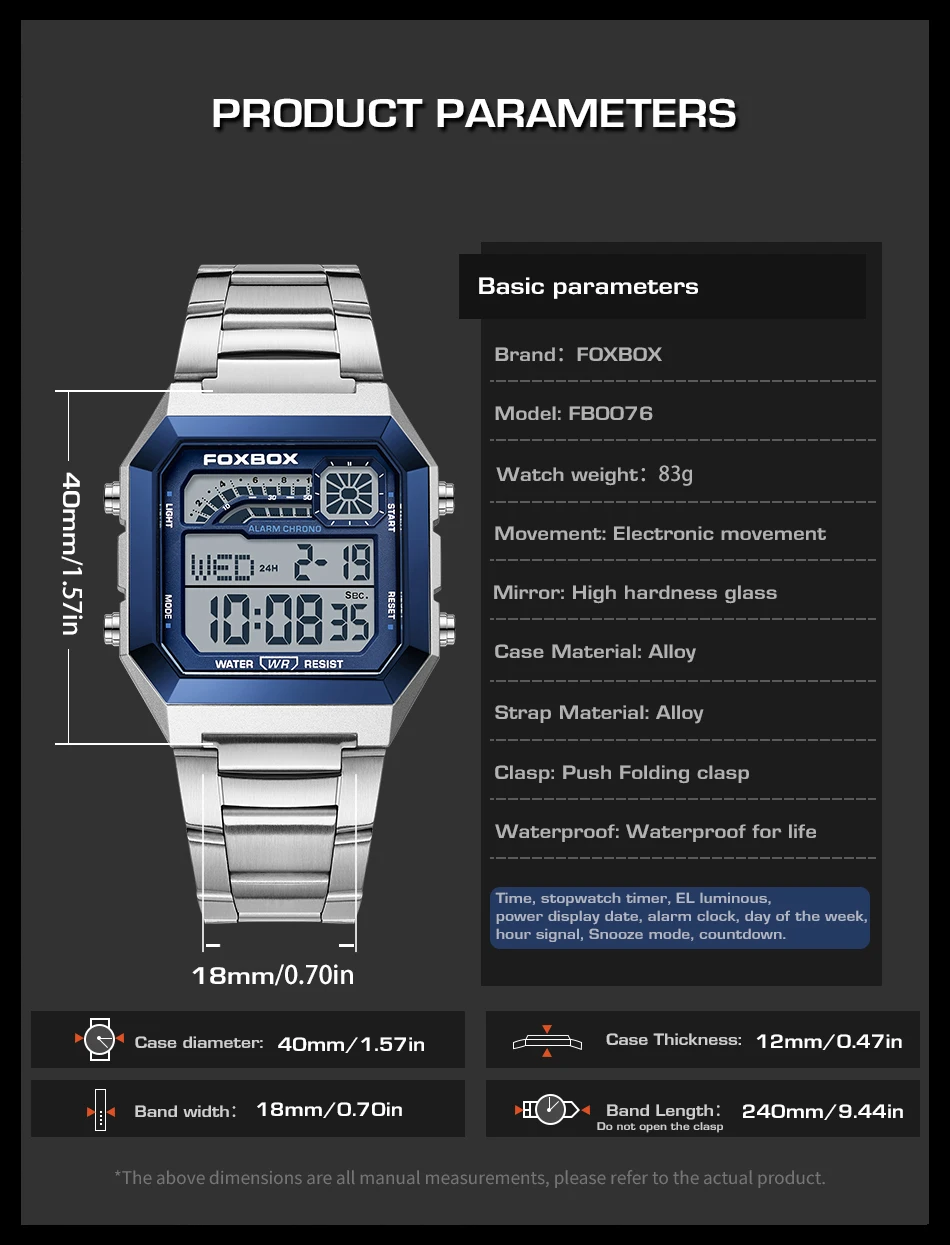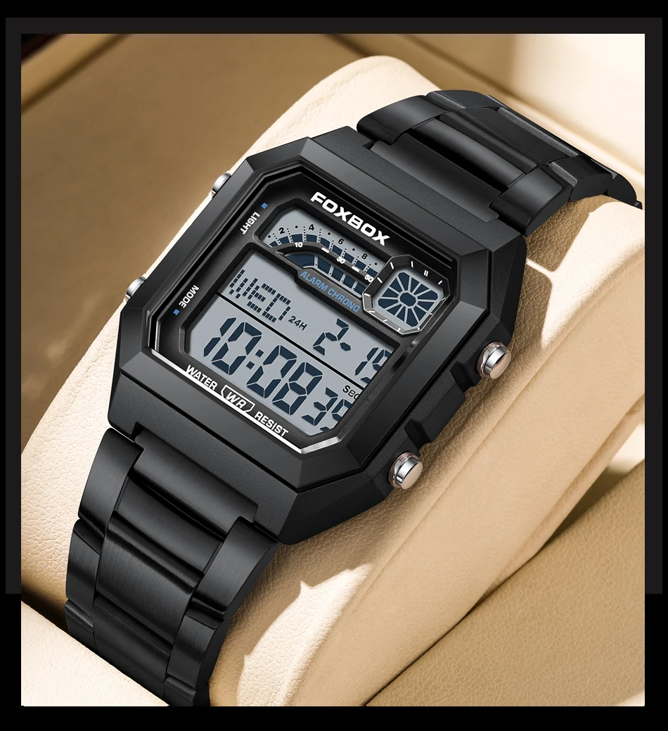 This FOXBOX men’s digital watch offers a clean, modern look with practical everyday features. Built with a stainless steel case and band, it provides durability, comfort, and a refined style suitable for casual wear, work, or daily use.